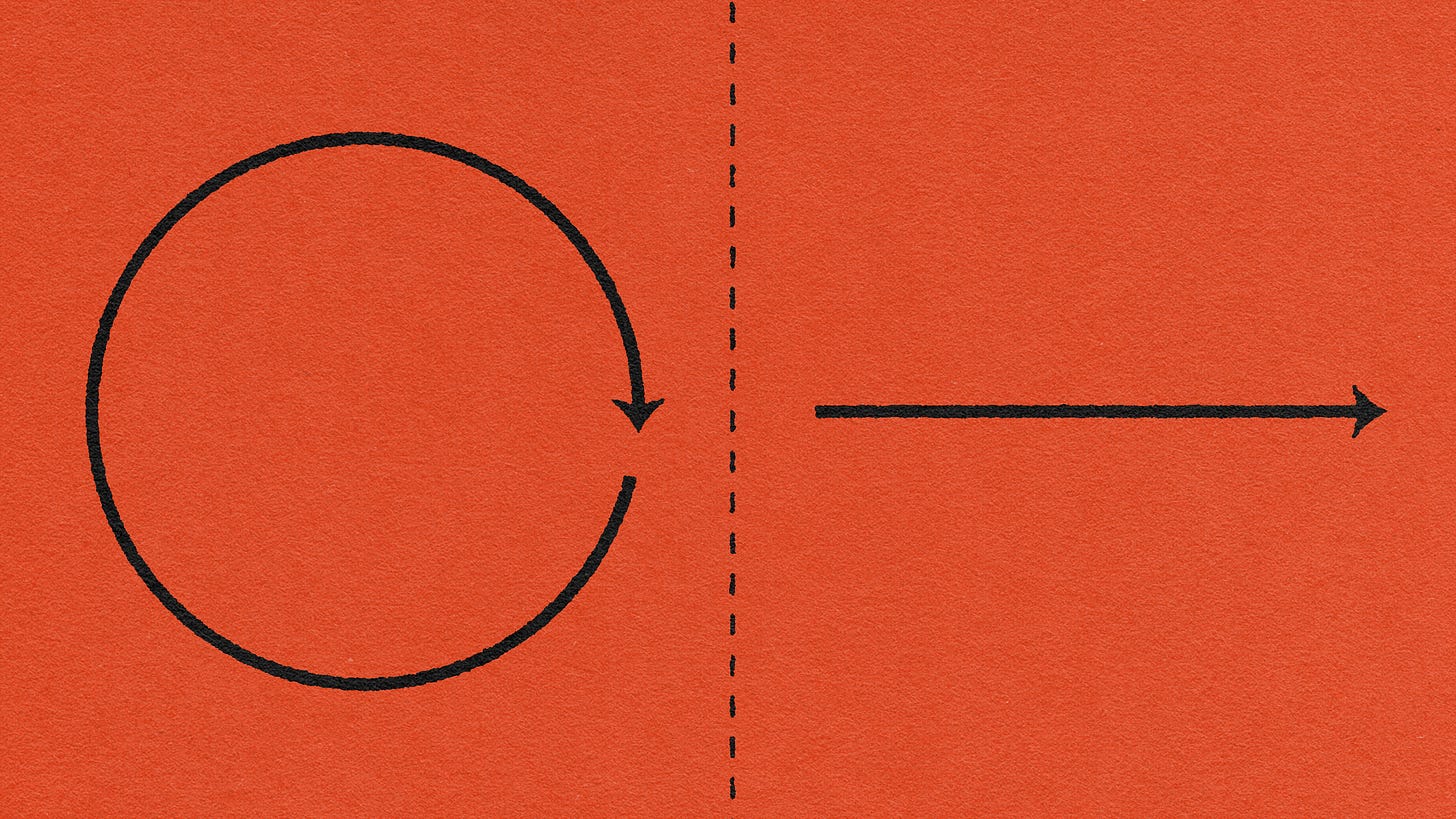 لذا من المطمئِن أن نتخيّل أن الزمن دائريٌّ وليس خطيًّا. فتقسيم مسارنا نحو المجهول والموت إلى وحدات زمنية دورية يعطينا وهم السيطرة عليه. إن "العام الجديد" (و"قراراته") يصيغ المجهول كتكرار للمعلوم ويمنحنا وهم القدرة على التحكم. أوهام تخدرنا فلا نلحظ مرور الوقت، نفاد الوقت.